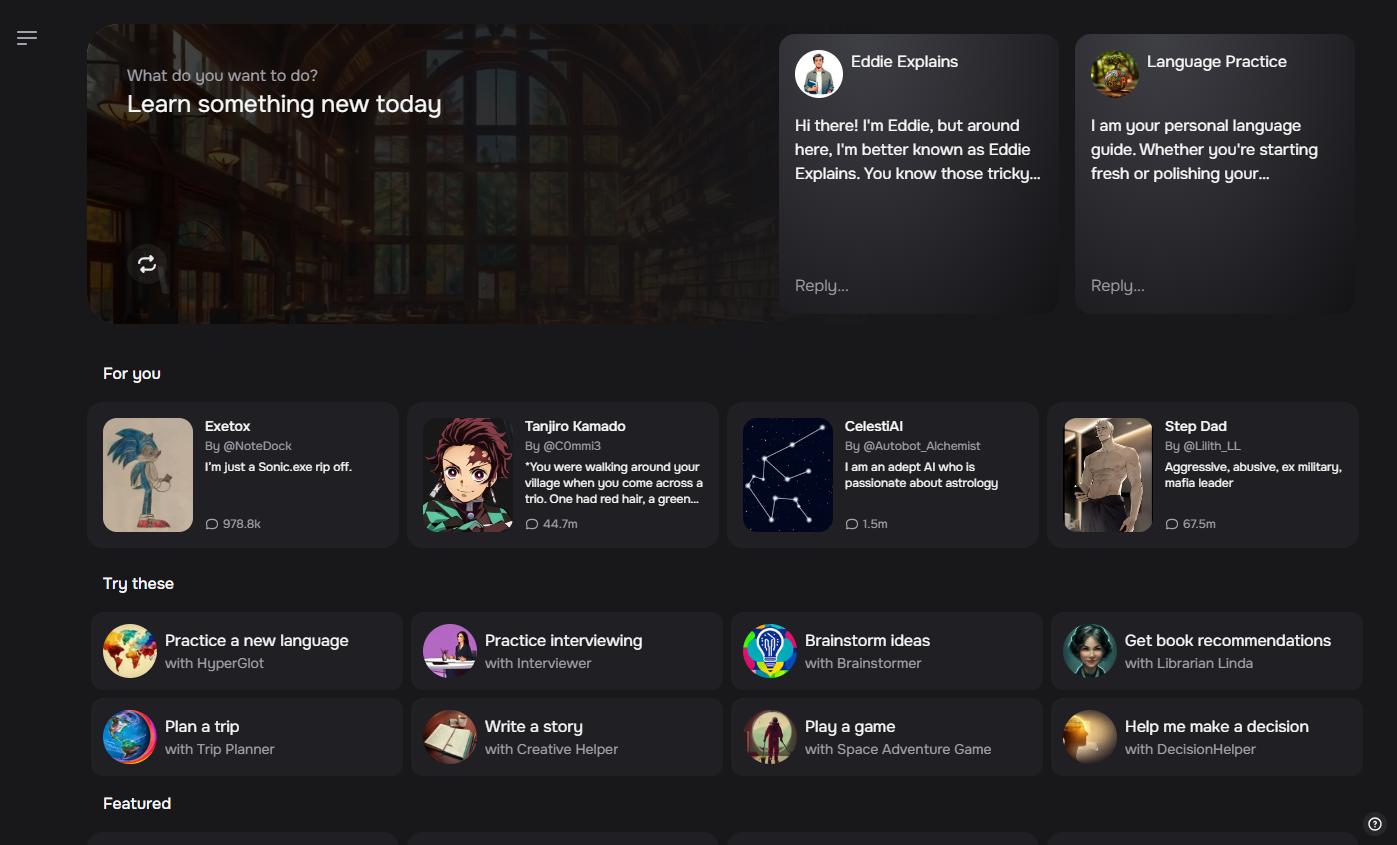 - Creación de contenido: Escritores y desarrolladores pueden interactuar con personajes de IA para generar ideas o desarrollar historias.